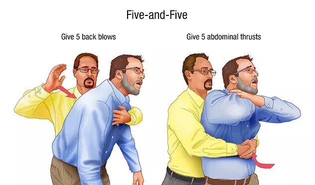 With the heel of your other hand give them five sharp back blows between their shoulder blades.